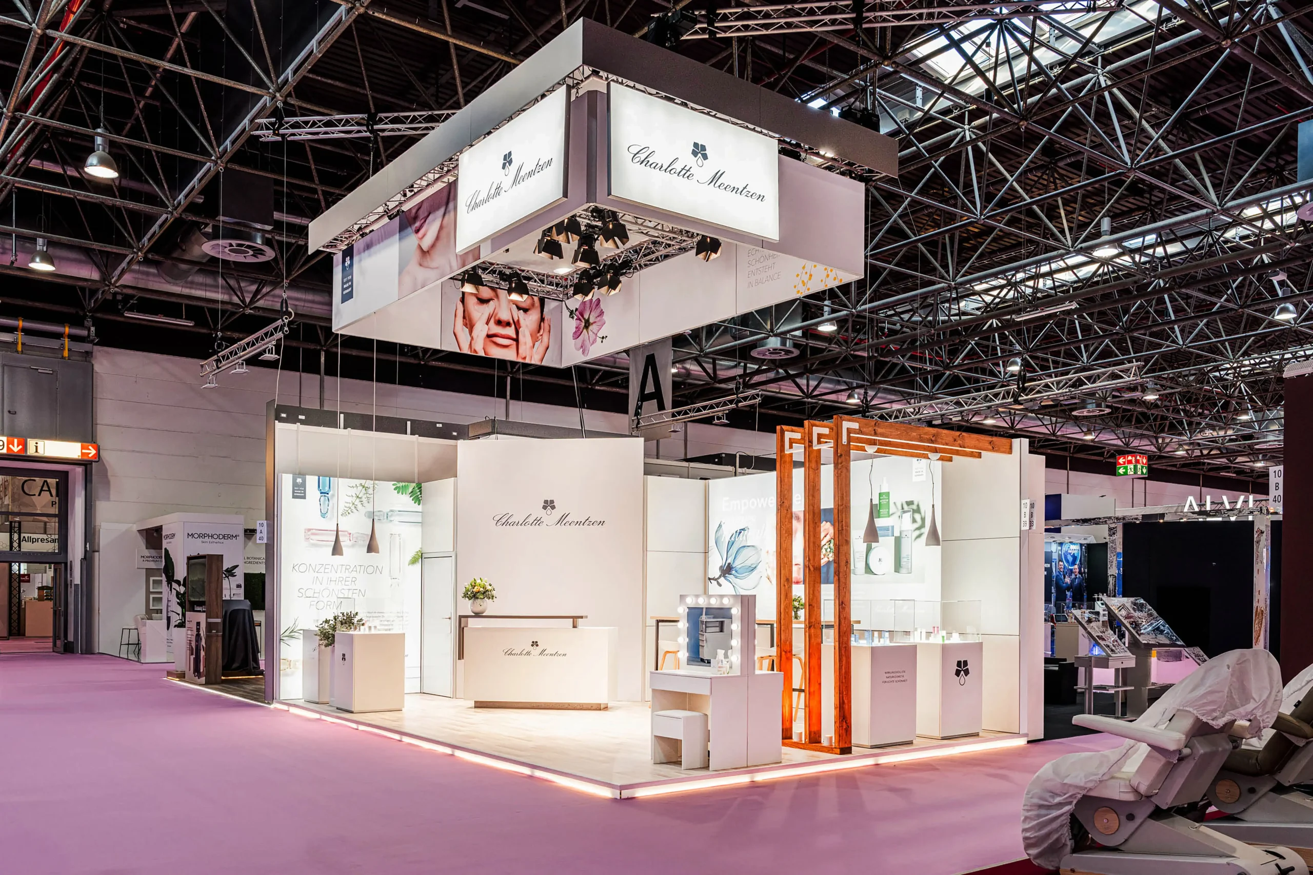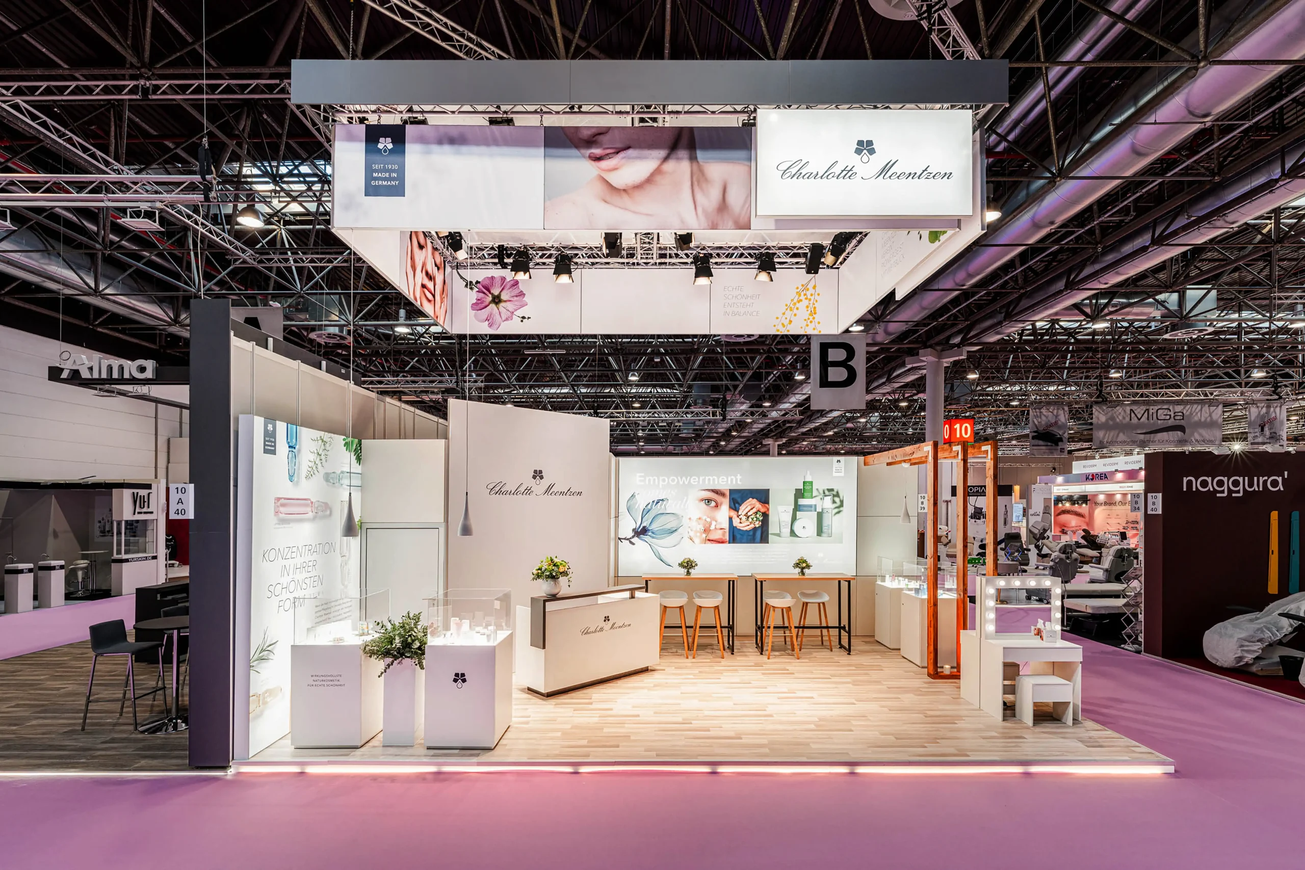 Meentzen, ein Unternehmen im Kosmetikbereich, hat es mit seinem kleinen Messestand gleich durch mehrere Aspekte geschafft, aus der Masse herauszustechen. Zum einen hat das Unternehmen die komplette Höhe seines Standes ausgenutzt und mit großflächigen Grafiken schon von der Ferne aus die Aufmerksamkeit der Messebesucher auf sich gezogen. Eine gezielte Beleuchtung half zusätzlich, alle Blicke auf sich zu ziehen. Der Stand war außerdem so gestaltet, dass die Produkte im Vordergrund standen, ohne den Raum zu überladen. Dafür wurden sie am Rand des Messestands und den Laufwegen der Besucher platziert. Besonders auffällig war die Darstellung verschiedener Kosmetikprodukte und die Möglichkeit, deren Anwendung direkt auszuprobieren – zum Beispiel an kleinen Schminktischen mit professionell ausgeleuchteten Spiegeln. Das minimalistische Design, das helle Farbschema und die Holzelemente sorgten ebenfalls dafür, dass der Messestand eine einladende Atmosphäre verkörperte und die Markenbotschaft des Unternehmens perfekt in Szene setzt.