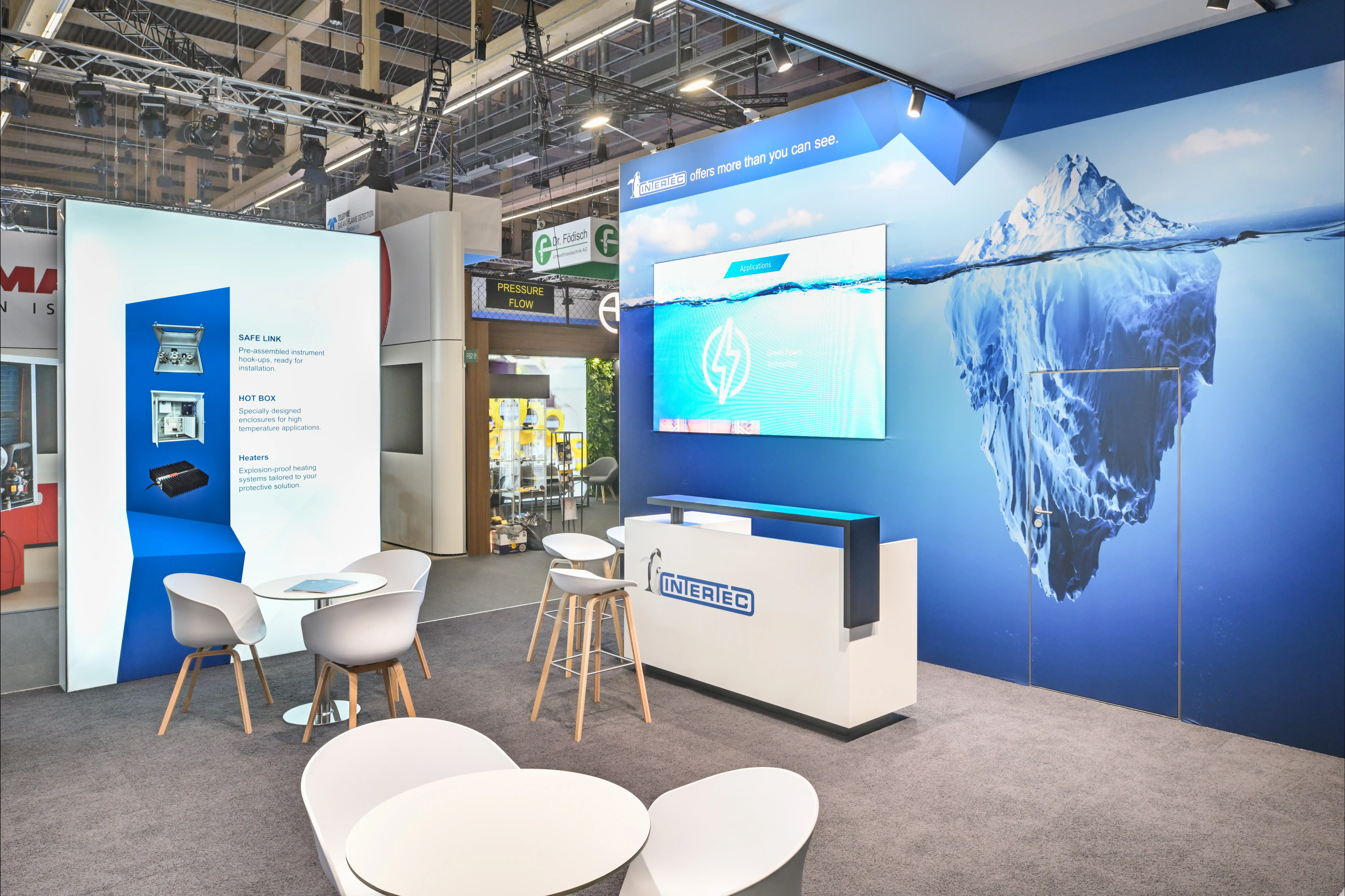 Intertec, ein Ingenieurunternehmen, fiel mit einem kleinen Messestand auf, der auf eine minimalistische Gestaltung setzte und dennoch mit modernen Technologien punkten konnte. So konnten die Messebesucher an einem großen Display die neuesten Innovationen des Unternehmens in kurzen Produktfilmen erleben und für weitere Informationen oder Nachfragen entspannt Platz nehmen und mit dem Standpersonal ins Gespräch kommen. Auch aus diesem Grund war der Einsatz ihrer multifunktionalen Möbel besonders hervorzuheben, die als Eyecatcher und zusätzlich als Präsentationsflächen dienten. Die ansprechende Beleuchtung des Messestands hat ebenfalls dazu beigetragen, den Stand deutlich hervorzuheben. Zusammengenommen haben die durchdachte Raumnutzung, das minimalistische Design und die Integration digitaler Tools dafür gesorgt, dass ihr Stand trotz begrenzter Fläche viel Aufmerksamkeit auf sich zog und das Unternehmen ihre Zielgruppe so direkt ansprach.