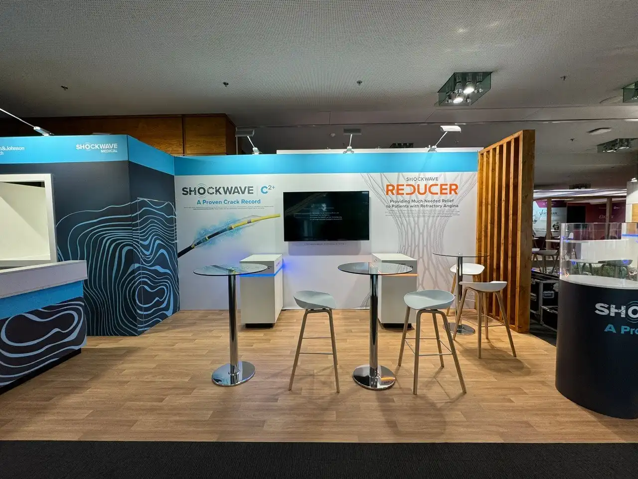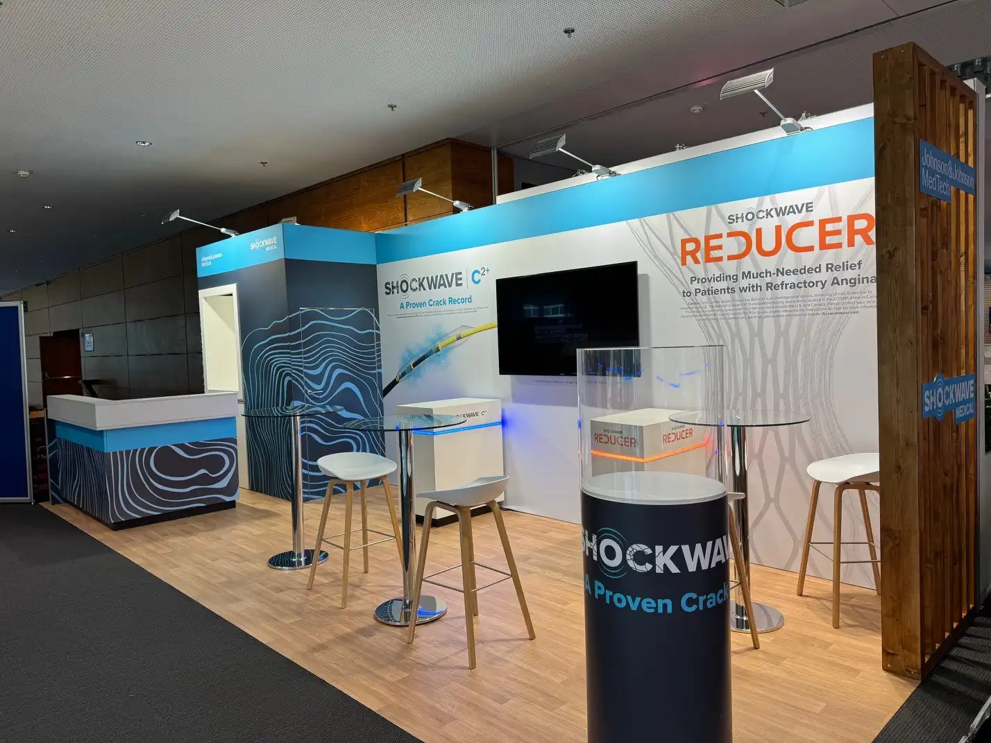 Shockwave, ein Unternehmen aus dem medizinischen Bereich hatte die Herausforderung, mit einem kleinen Messestand eine möglichst hohe Aufmerksamkeit zu erzielen. Die Lösung: Licht als strategisches Gestaltungselement. Daher wurde der Stand mit einer LED-Beleuchtung ausgestattet, die nicht nur gekonnt den Raum vergrößerte, sondern den Messestand auch aus der Ferne gut sichtbar machte. Zusätzlich wurde ein digitaler Bildschirm integriert, der den Besuchern ermöglichte, sich über die neuesten Produkte und Innovationen des Unternehmens zu informieren. Diese durchdachte Raumnutzung und die gezielte Lichtgestaltung führten dazu, dass der Stand zu einem echten Hingucker wurde.