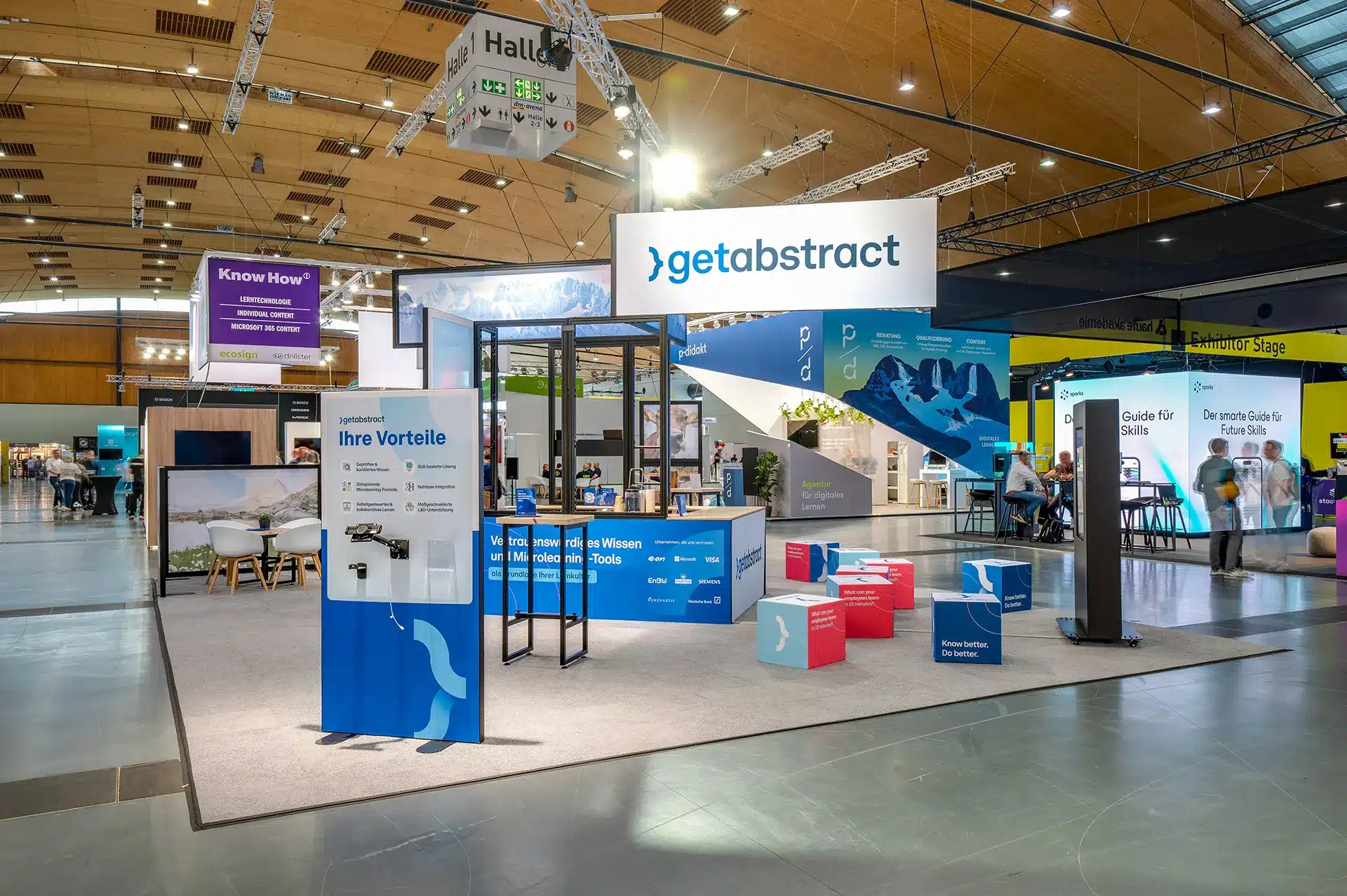 - Große Stände brauchen eine durchdachte Struktur mit interaktiven Elementen und Meeting-Zonen.