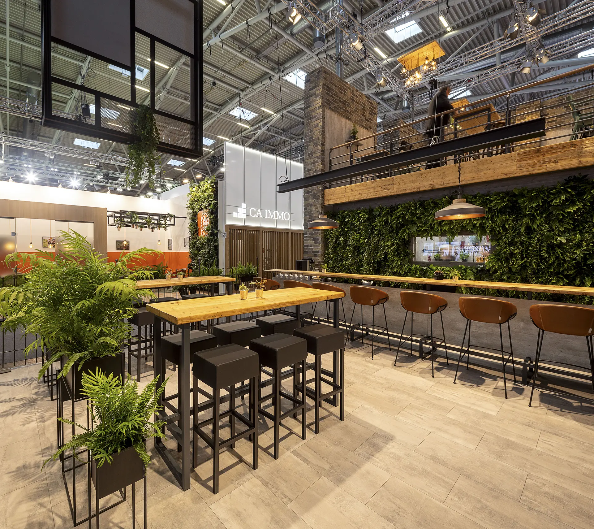 Pflanzen, Holz und warme Farbtöne sorgen für eine angenehme Atmosphäre, die dazu führt, dass Besucher länger am Stand verweilen. - Viele Sitzgelegenheiten: