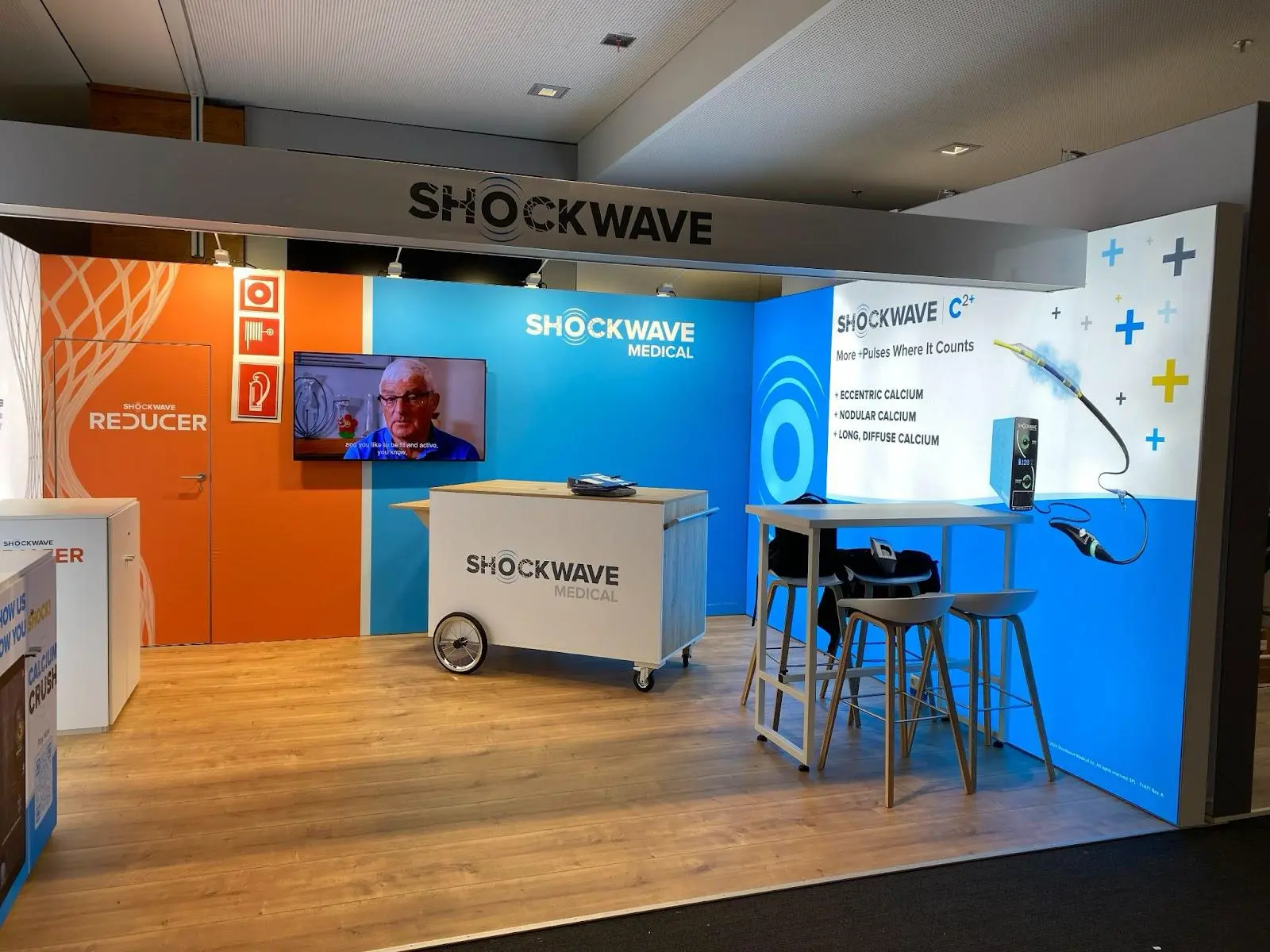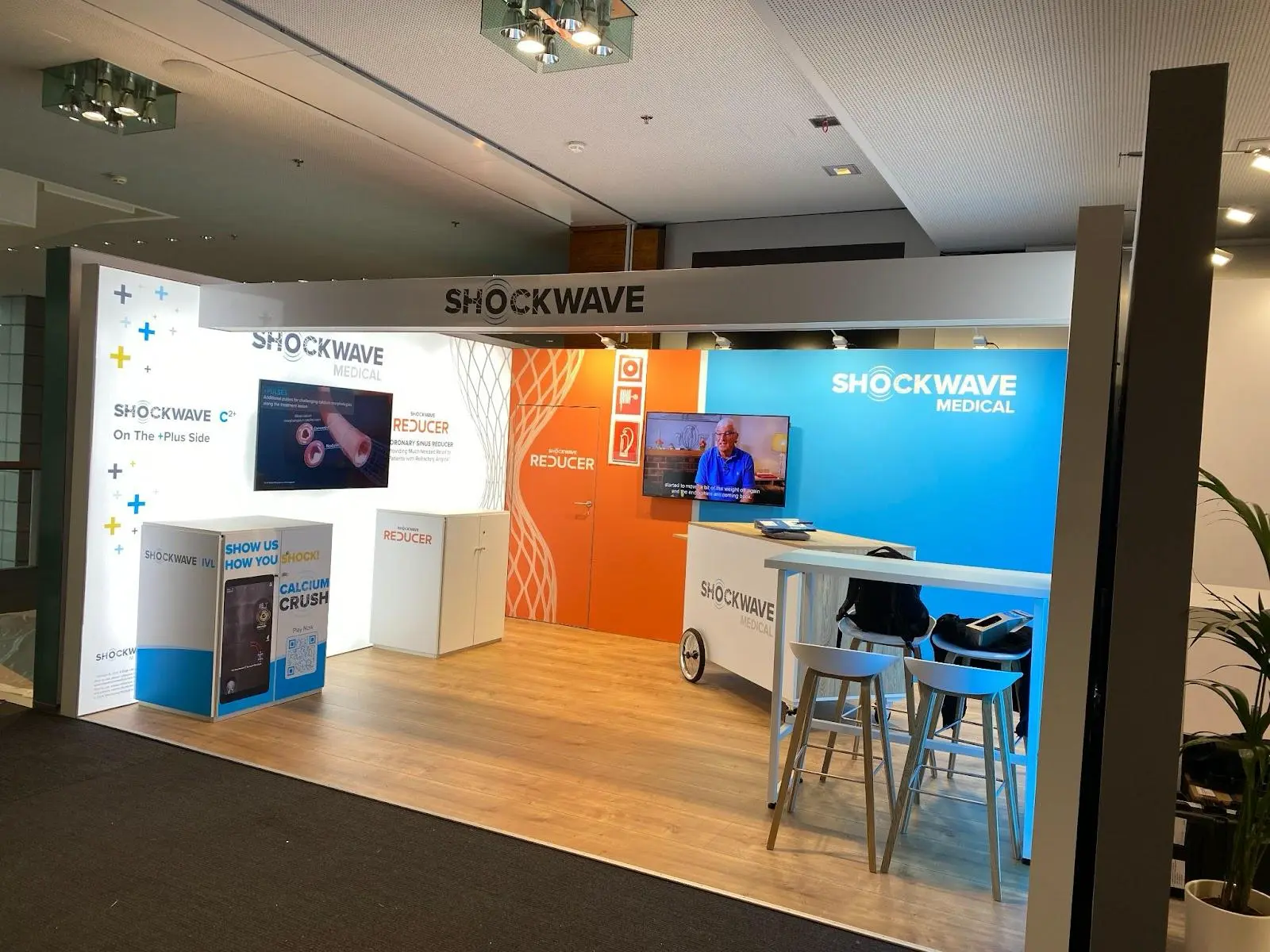 Die größte Herausforderung bei Shockwave war die ungünstige Platzierung des Standes in einer schlecht beleuchteten Ecke der Messehalle. Um trotzdem aufzufallen, wurde gezielt mit Licht und Höhe gearbeitet.